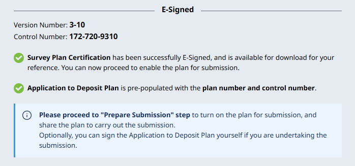 Complete this section in cases where the land surveyor is the applicant and is e-signing and submitting the plan and plan application. If you intend to email the plan and plan application to a different LTSA customer, proceed to Prepare Submission.