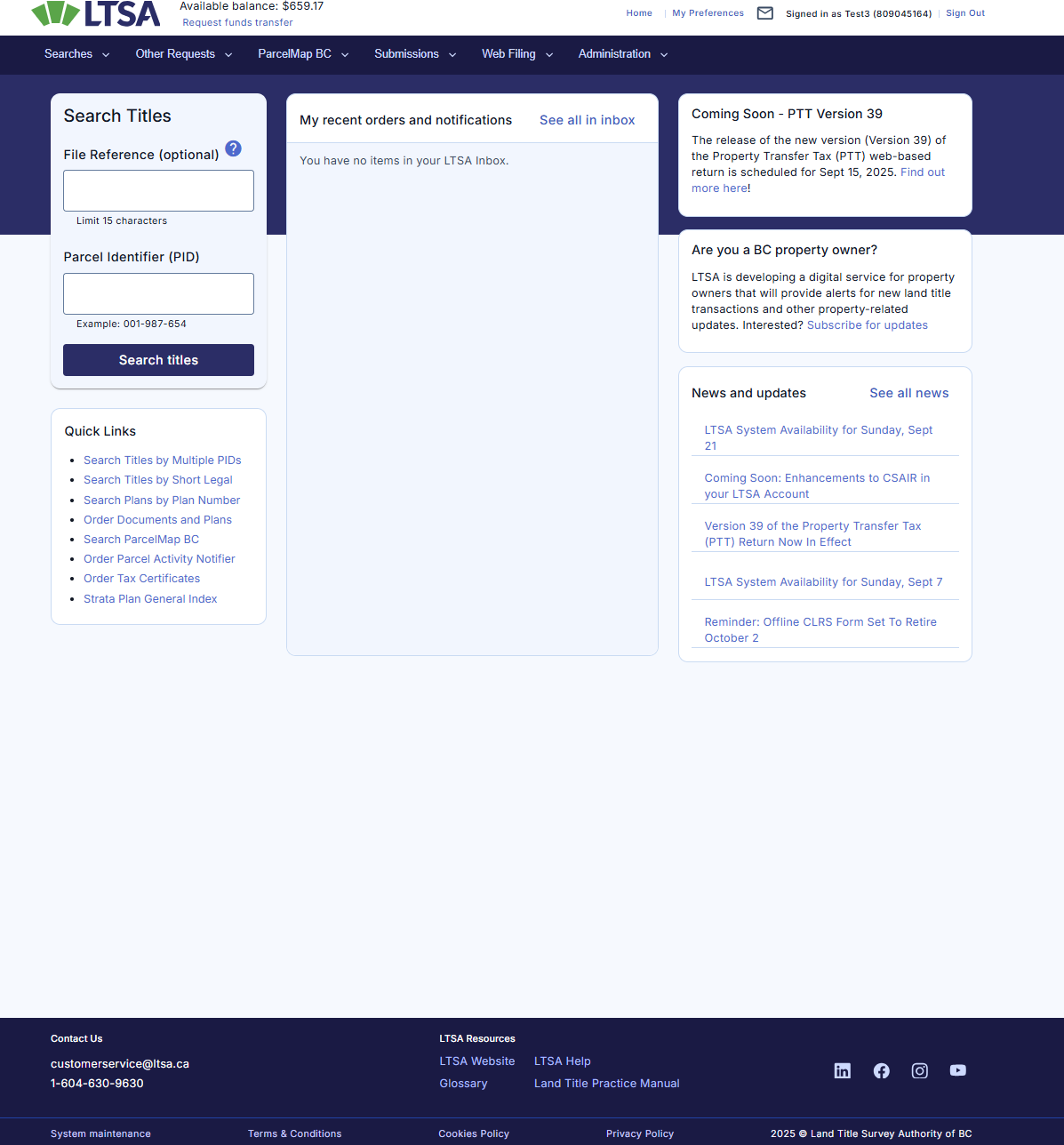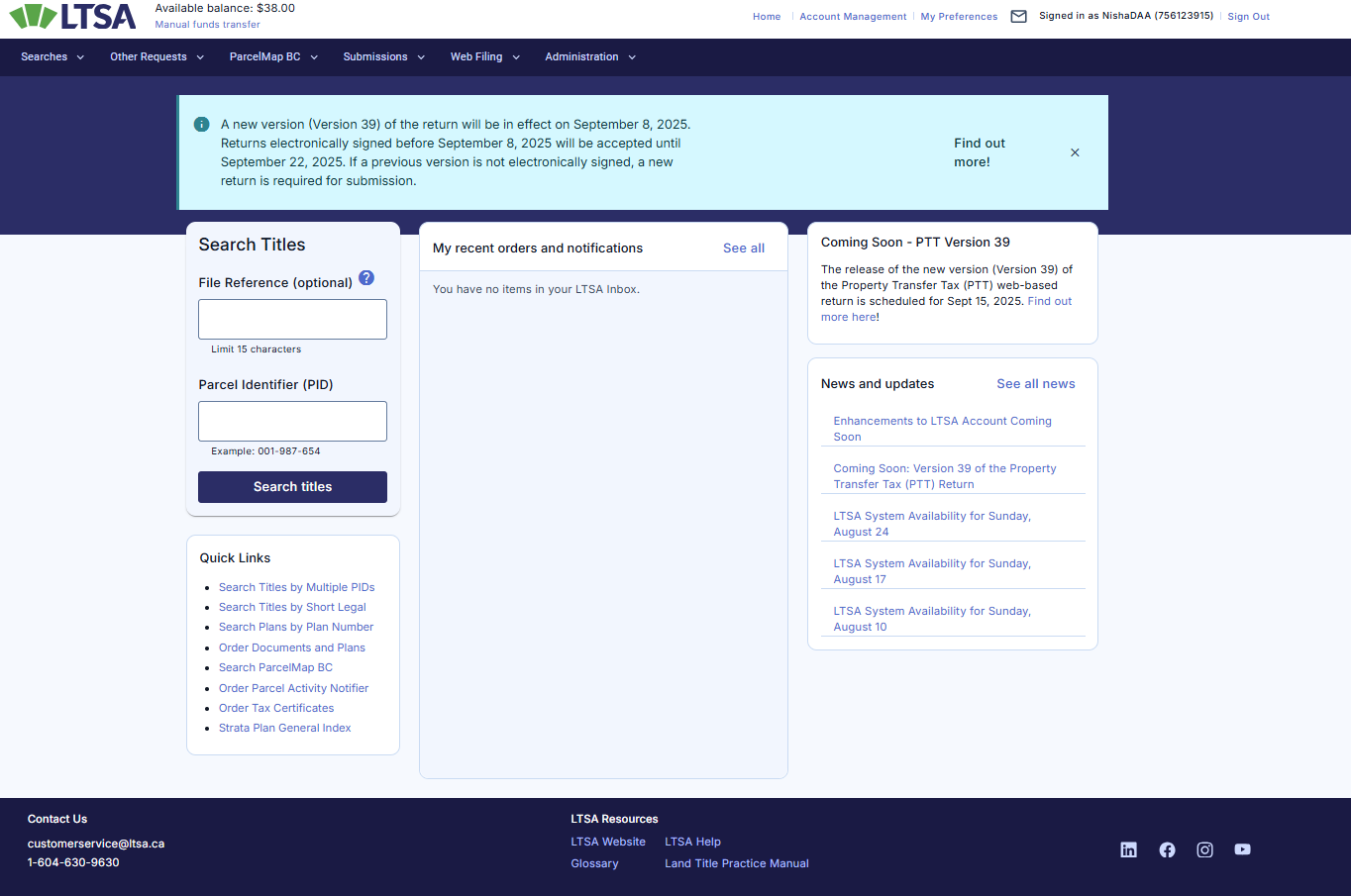 - Inbox links to the LTSA Account Inbox