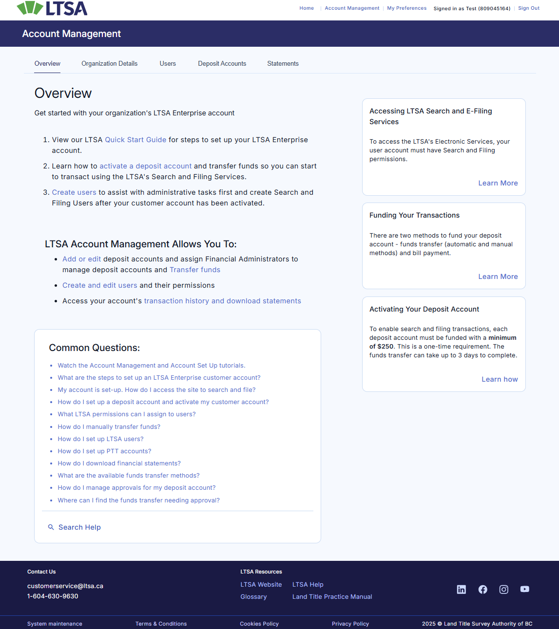 - Home links to the Account Management Overview page. Clicking on the LTSA Logo performs the same action as Home or returns to the Account Management Overview page.