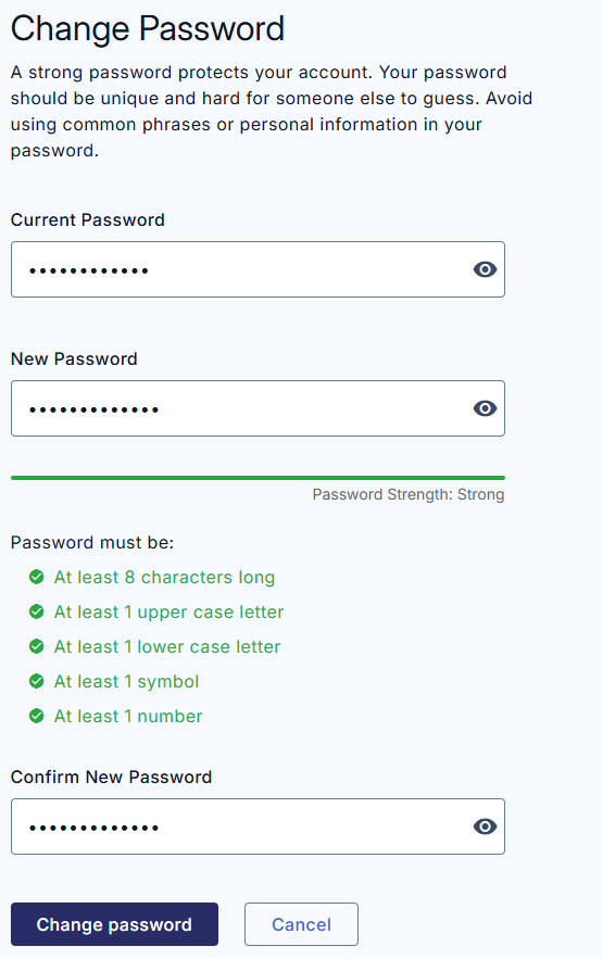 Click Change password to complete. To discard your changes and return to the previous page, click Cancel.