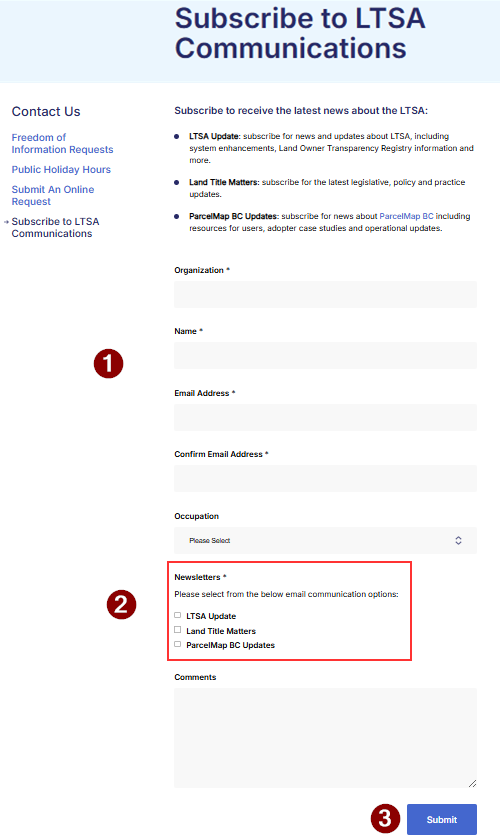 If you do not have a LTSA account, you can subscribe to receive LTSA's news, LTSA service updates, and land title practice communications on the LTSA's website.