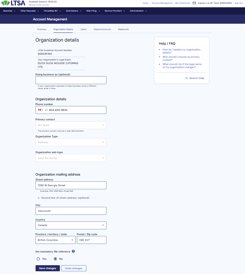 Modify the information in the fields as necessary. If your organization's legal name needs to be changed, contact LTSA Technical Support. You will not be able to change your organization's legal name.