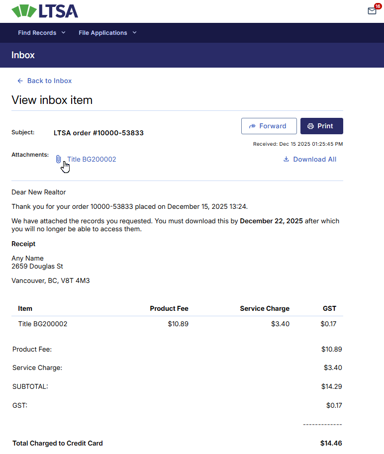 The Inbox will only show orders made in the past 12 months. If a new item is in the Processing status, click Refresh Inbox to update the status. Items in the LTSA Inbox are available for download for up to seven days, and once the item has an Expired status, it is no longer available for download.