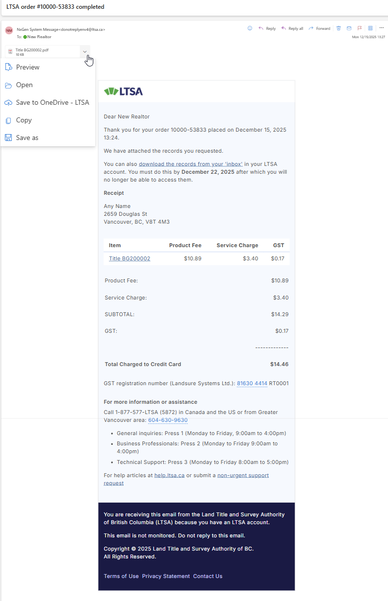 To download an item from the email receipt, open the corresponding email and click each PDF attachment to save it for your records or retain the email for future reference.