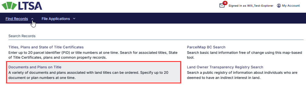 From the Explorer Find Records menu, click Documents and Plans on Title or from the Explorer home page, enter a document or plan number in the designated field and click Search records. If there are no matches, a status of "Not found' will be displayed.