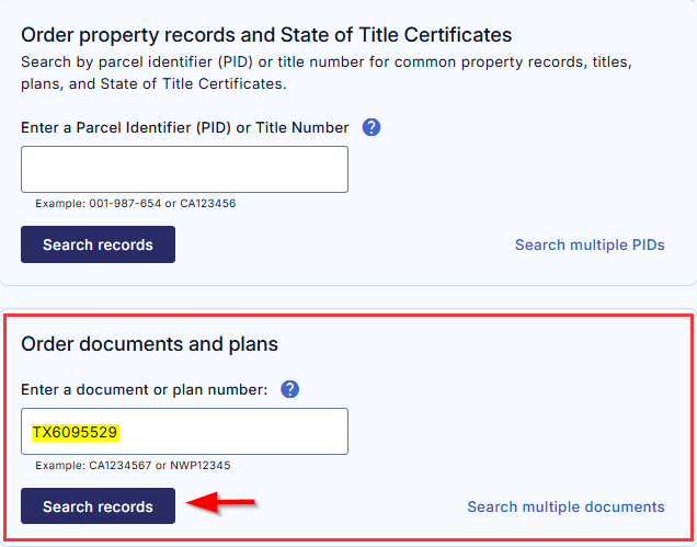 To add up to 20 additional document or plan numbers, click Search multiple documents and then click Add more fields (1/20).