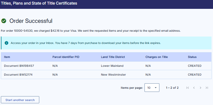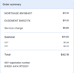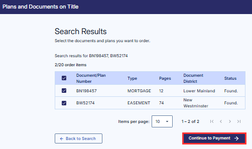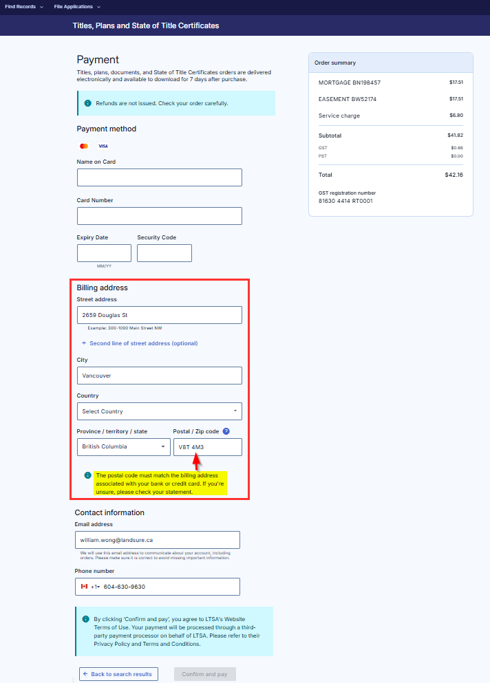 On the Payment page, the details of your order and associated fees are displayed. If you want to change the items selected for order or the charges shown, click Back to search results. If you want to cancel your order and start a new search, click Back to search results.