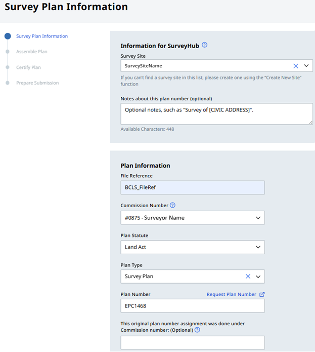 Select a previously created SurveyHub Survey Site and specify a File Reference (the applicant’s file number), Plan Statute, Plan Type and a pre-assigned Plan Number.